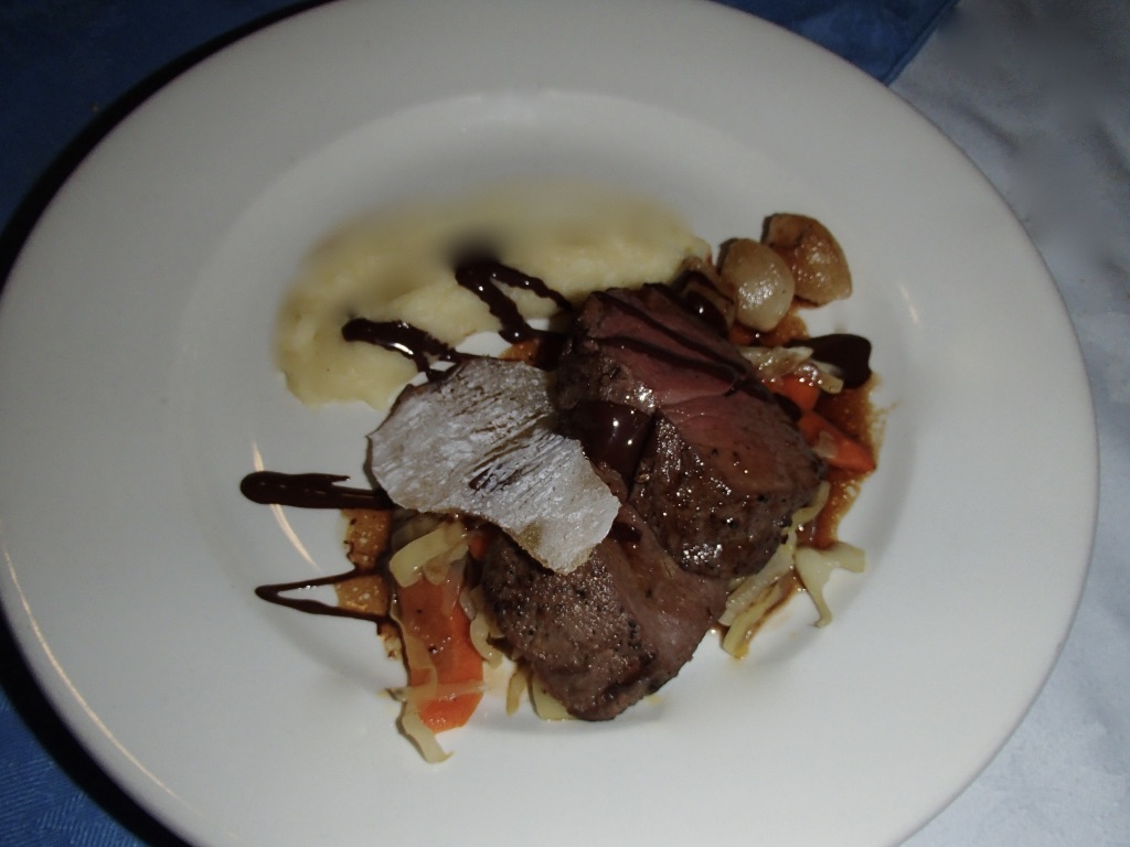 7th course Rack of Venison with Buttered Greens and chocolate oil